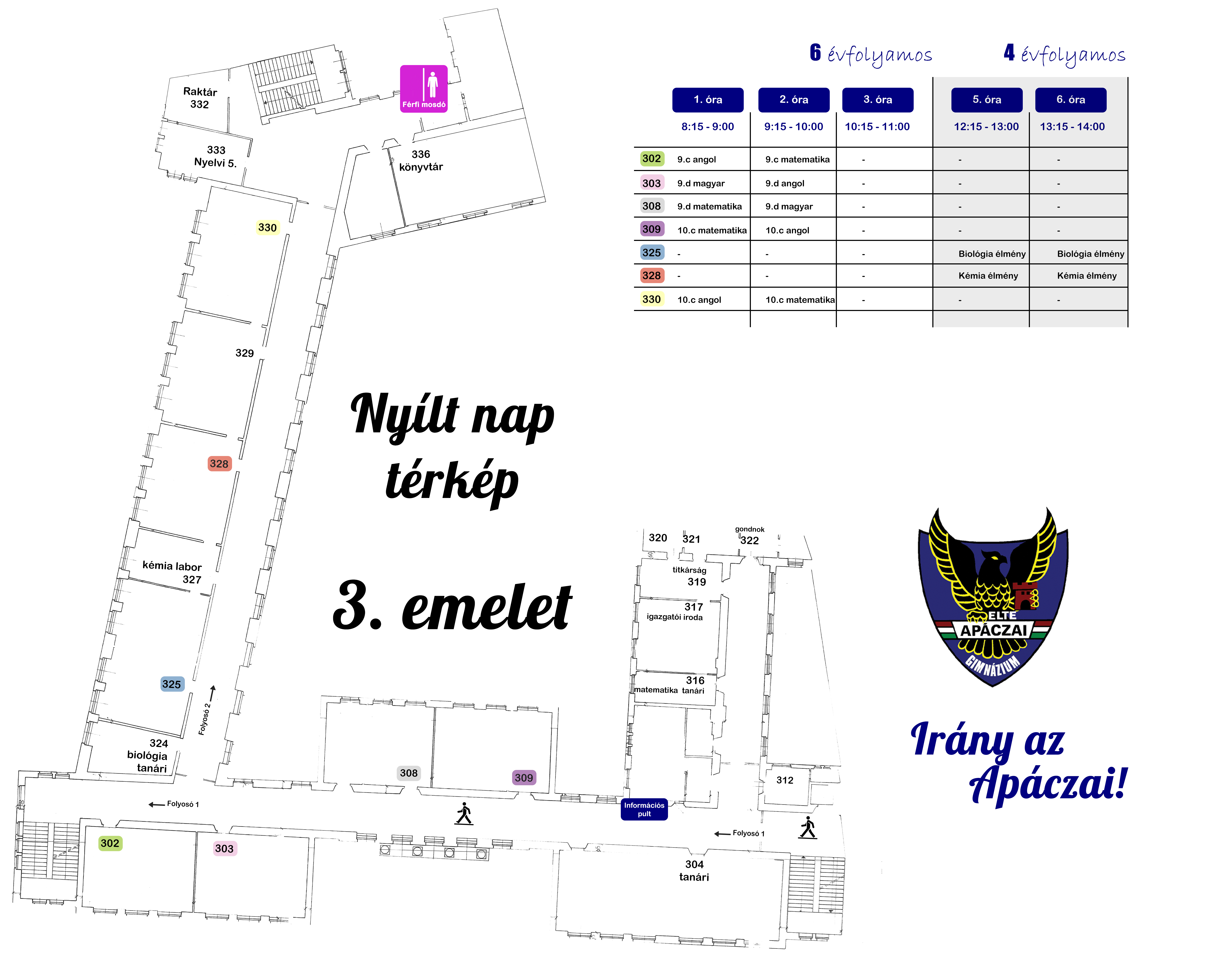 Az épületben való tájékozódást a belépéstől kezdve önkéntes diákjaink segítik.